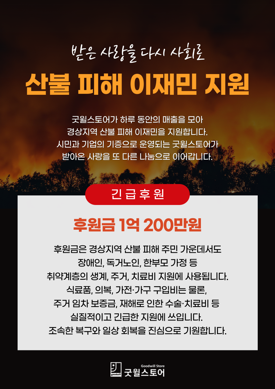 4월 24일(목) 19시부터 자정까지 🖥️홈페이지 리뉴얼 작업이 진행됩니다. 기증 내역 조회 기능과 스토리 콘텐츠 강화로 더욱 풍성한 서비스를 준비 중입니다. 작업 시간 동안 간헐적인 접속 지연이나 이용 제한이 발생할 수 있는 점 양해 부탁드립니다. 새로워질 굿윌스토어 홈페이지에 많은 기대 부탁드립니다! |