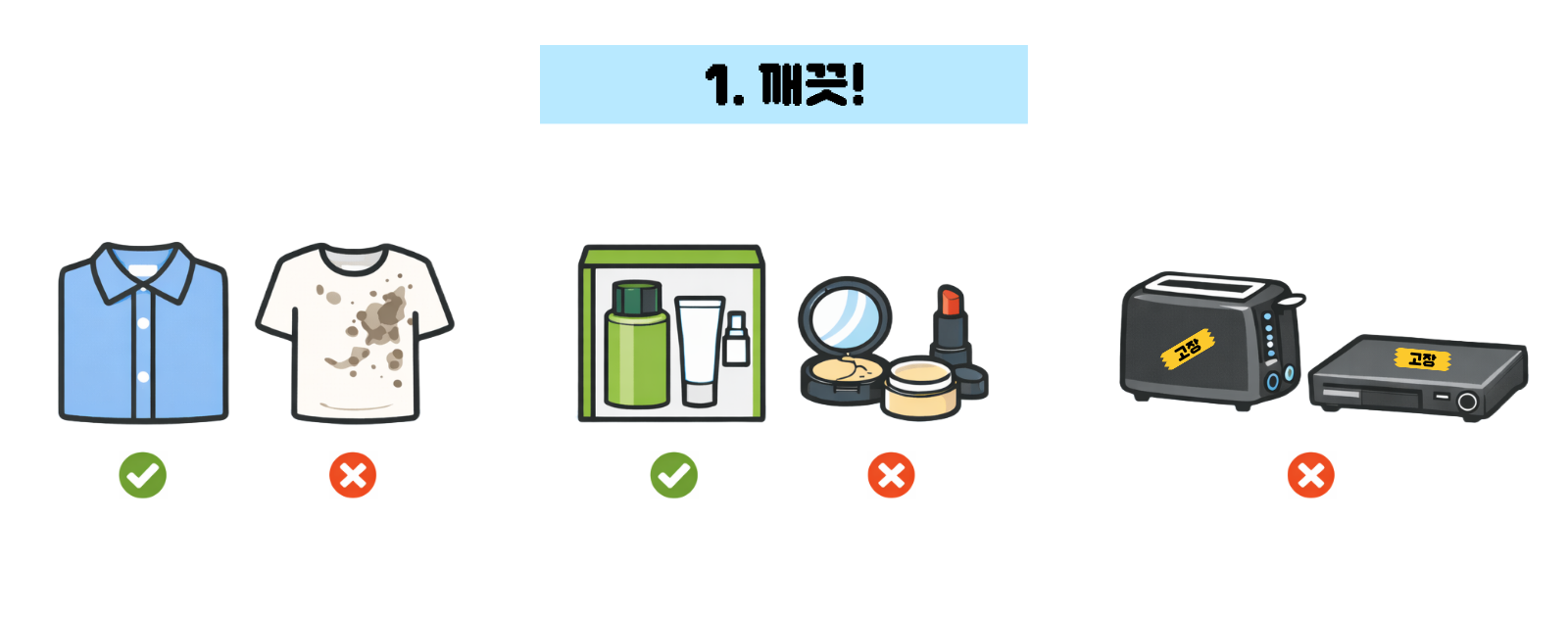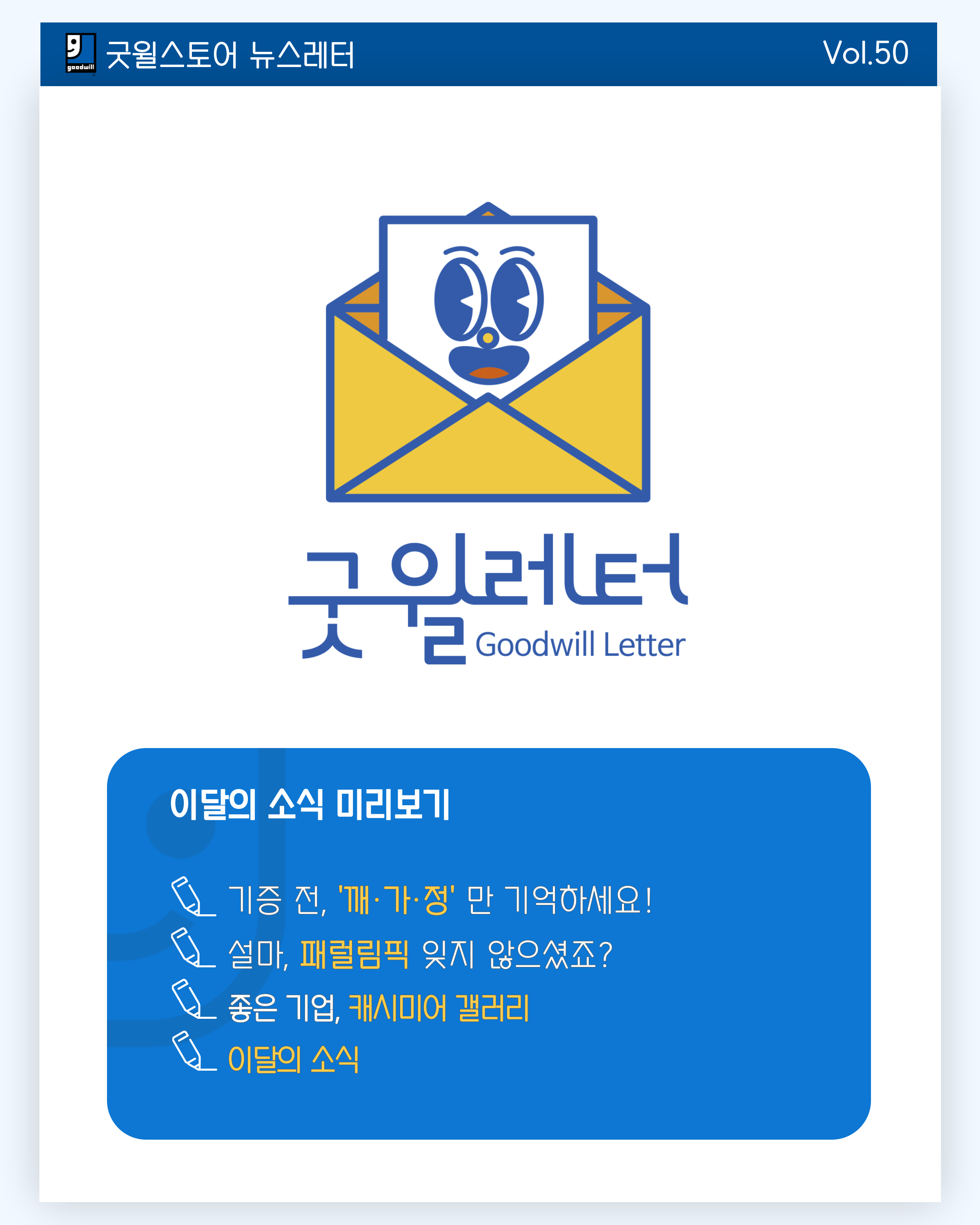 물품 기증할 때마다 “이건 기증되나요?” 헷갈리는 물건들이 있다고요? 그럴 땐 깨·가·정을 기억하세요! 안녕하세요. 💌굿윌레터입니다. 어느덧 벌써 3월이 코앞! 3월부터가 진짜 한 해 시작인 거 아시죠?😏 밀렸던 물품 기증, 다시 시작하려는데… “이건 기증되나요?” 헷갈리는 물건들이 있다고요?