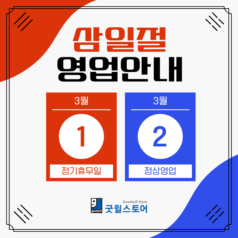 정기휴무일인 3/1(일)을 제외한 3/2(월) 대체공휴일에는 모든 굿윌스토어가 정상영업합니다.