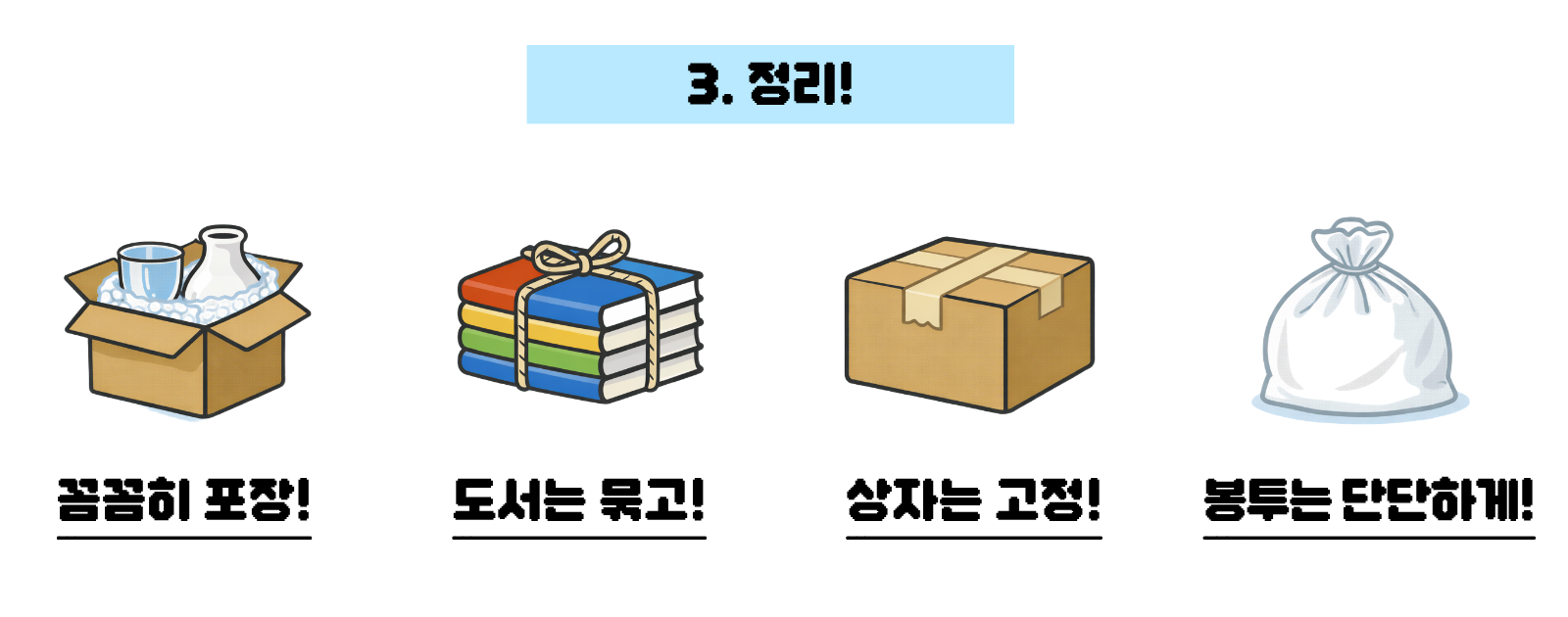 파손 위험이 있는 물품은 신문지나 완충재로 꼼꼼히 포장! 도서는 묶고! 상자는 테이프로 고정! 봉투는 풀리지 않게 단단히!